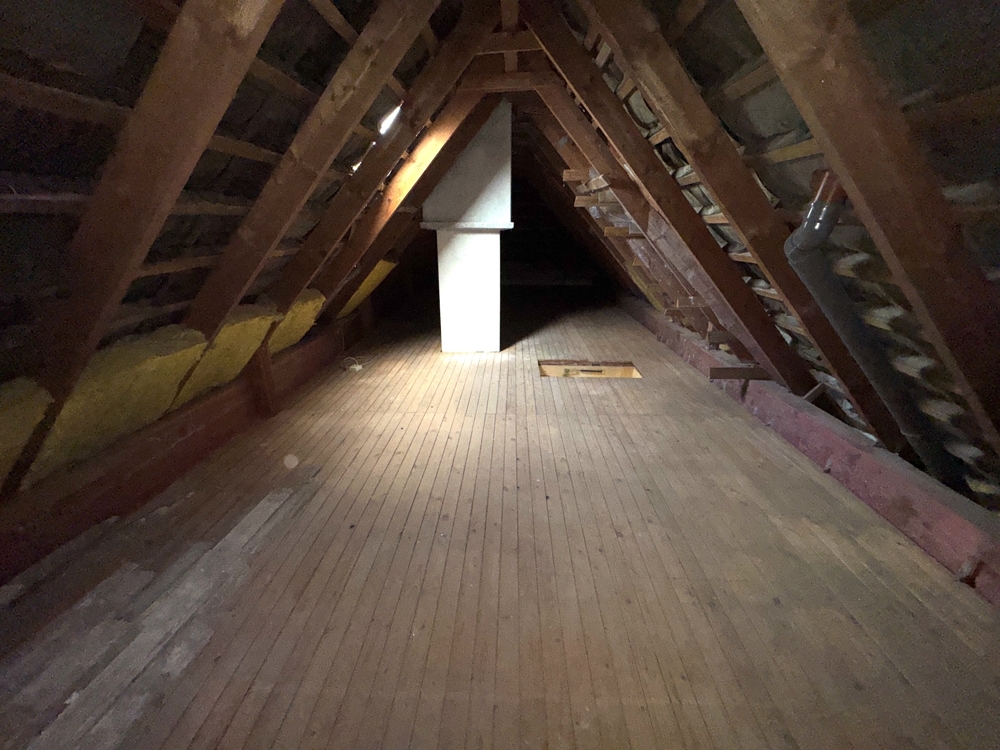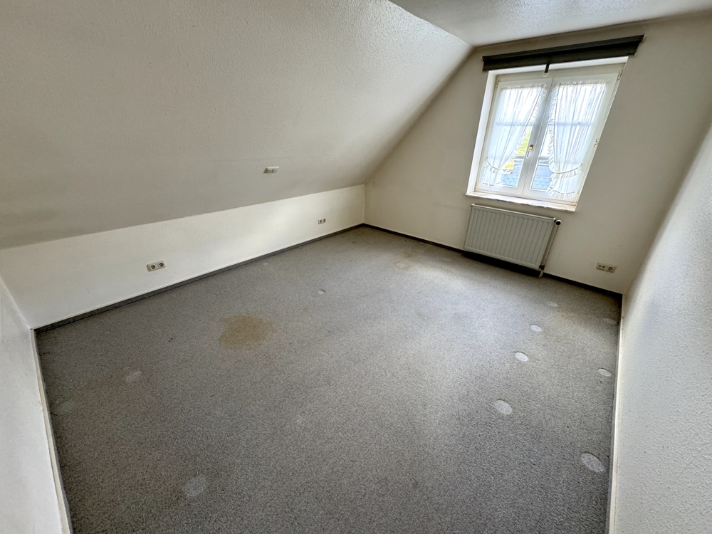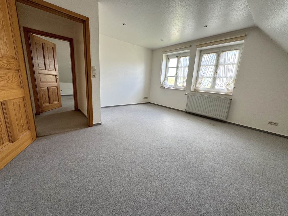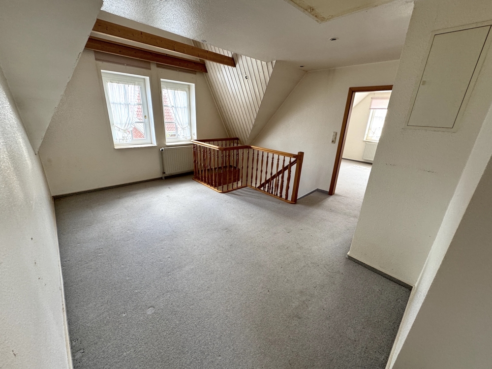 Im Dachgeschoss befinden sich vier weitere Schlafräume und ein Badezimmer. Der Giebelbereich ist in einer offenen Bauweise gestaltet. Das Dachgeschoss ist mit 4 Zimmern und einem Vollbad voll ausgebaut. Der Spitzboden bietet viel Staufläche.