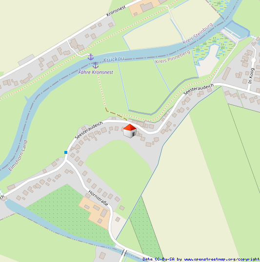 Das Wohnhaus befindet sich in einer ruhigen Nebenstraße. Der Deich und die Fähre Kronsnest befinden sich direkt auf der gegenüberliegenden Straßenseite. Hier geschieht das Übersetzen über die Krückau nach alter Seemannsart durch sogenanntes „Wriggen“ mit einem „Riemen“.