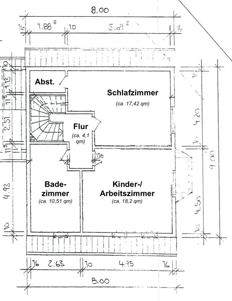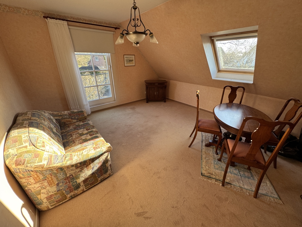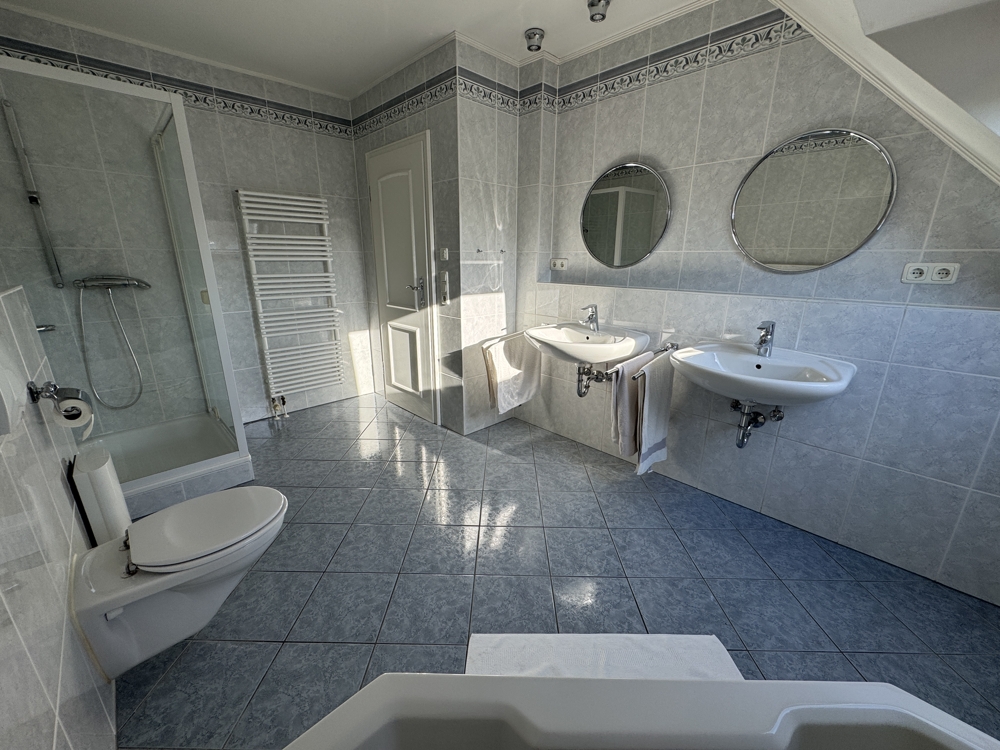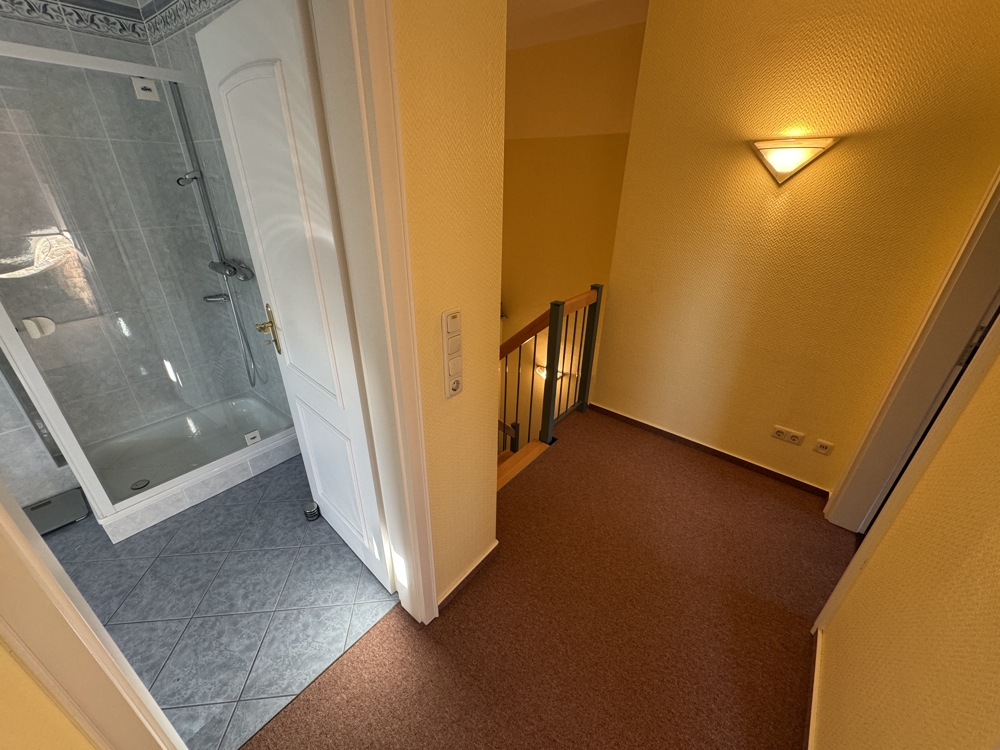 Via Holztreppe gelangen Sie in das Obergeschoss, wo Sie zwei weitere Zimmer und das Vollbad vorfinden werden. Das Badezimmer ist mit einer Dusche, einer Eckbadewanne, einem Handtuchheizkörper und zwei Waschtischen ausgestattet. Vorherrschende Bodenbeläge sind Teppichböden.