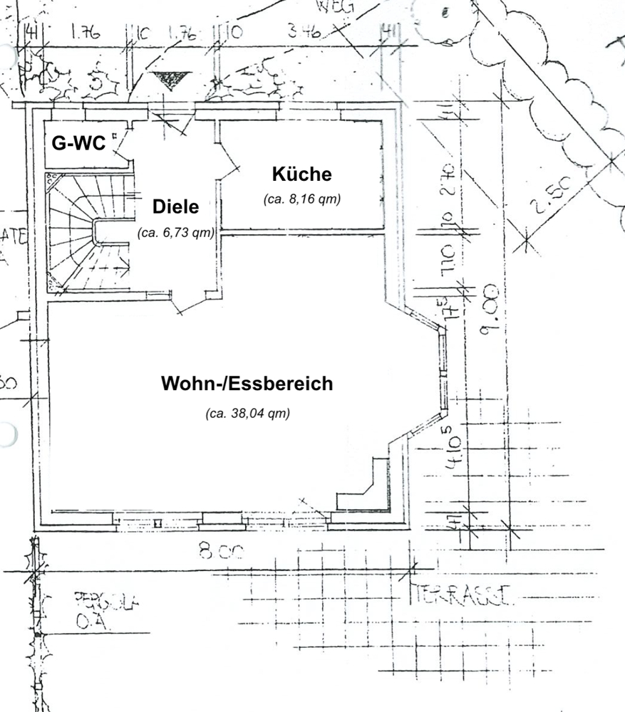 Das Erdgeschoss ist aufgeteilt in das sonnige Wohnzimmer mit Zugang in den schönen Gartenbereich, ein Gäste-WC sowie den Küchenbereich.