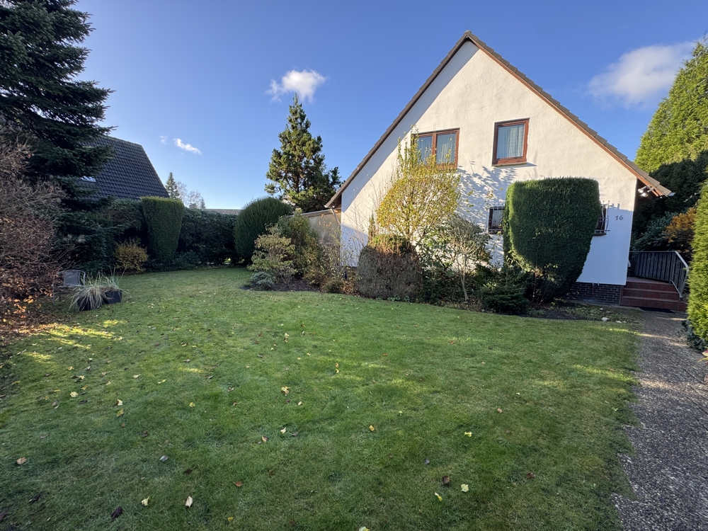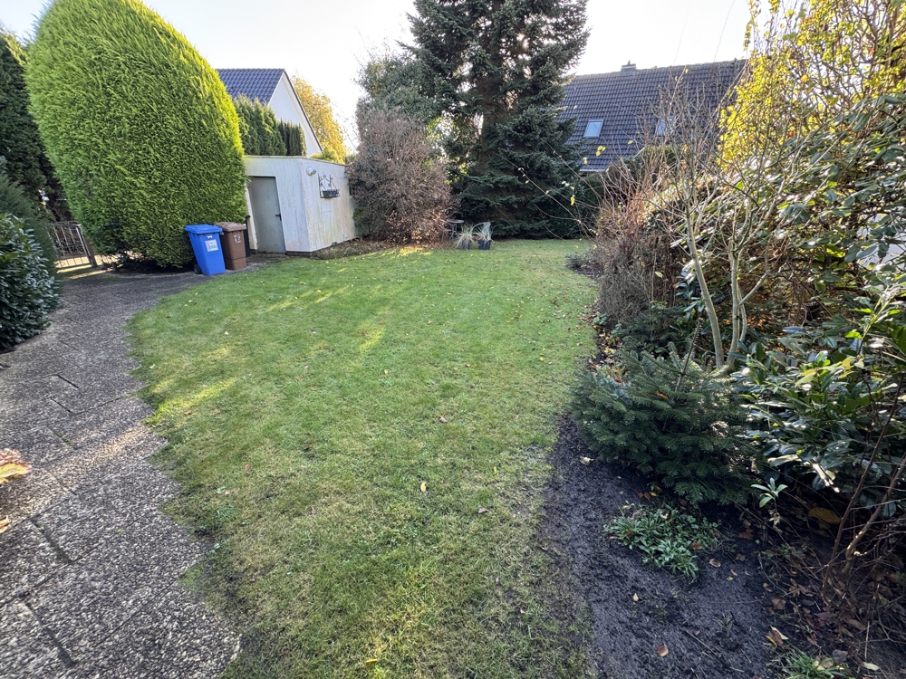 Der eingewachsene Gartenbereich liegt gut eingebunden zwischen Einfamilienhäusern und bietet eine ruhige, private Atmosphäre.