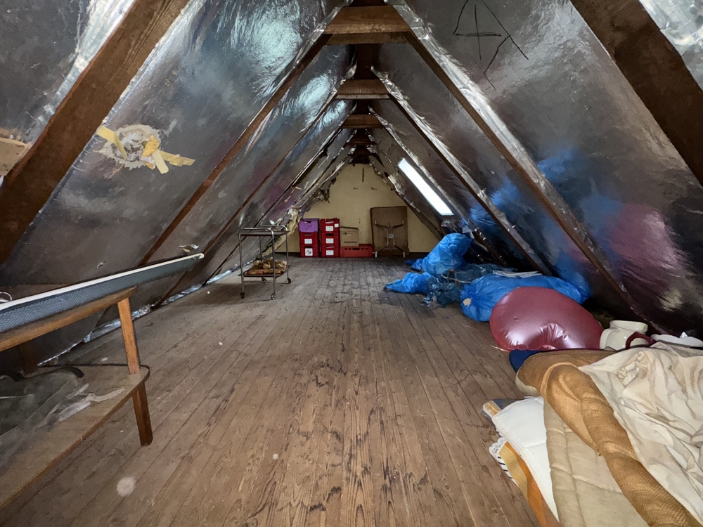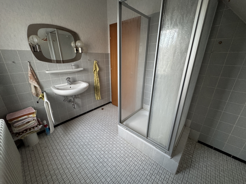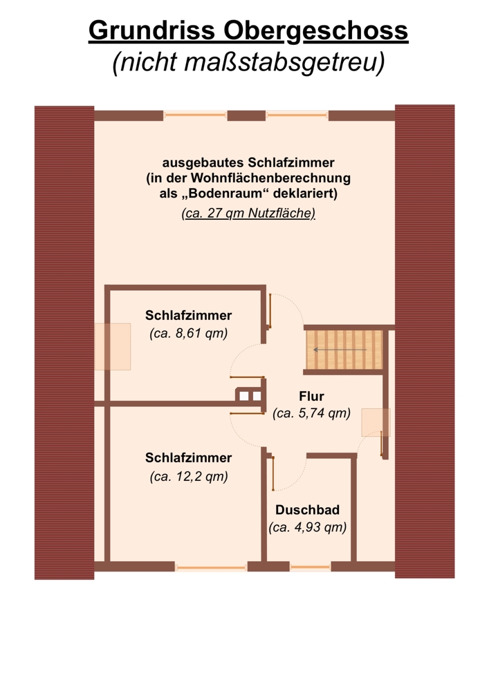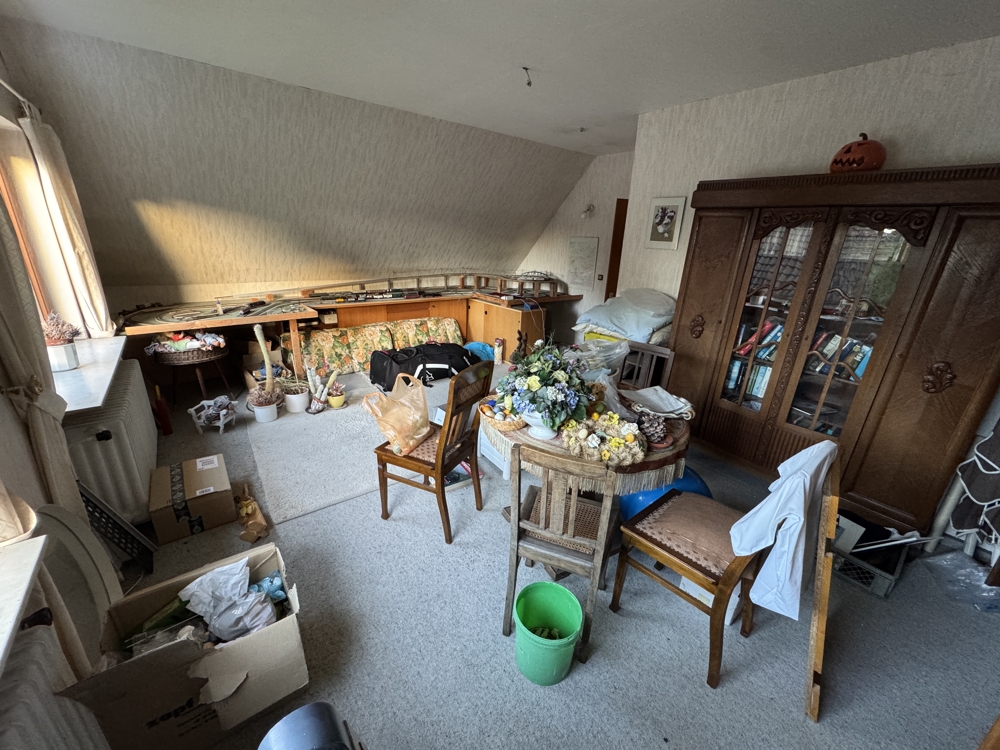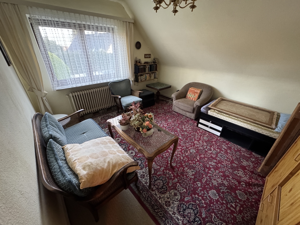 Via Holztreppe gelangen Sie in das Obergeschoss, wo Sie drei weitere Räume und ein Duschbad vorfinden werden. Zwei Kinderzimmer und ein großer Hobbyraum mit ca. 27 m² Nutzfläche schaffen ideale Voraussetzungen für das Familienleben. Vom Flur gelangen Sie über eine Bodeneinschubtreppe in den Spitzboden. Dieser dient allerdings aufgrund der Gegebenheiten eher als Abstellfläche.