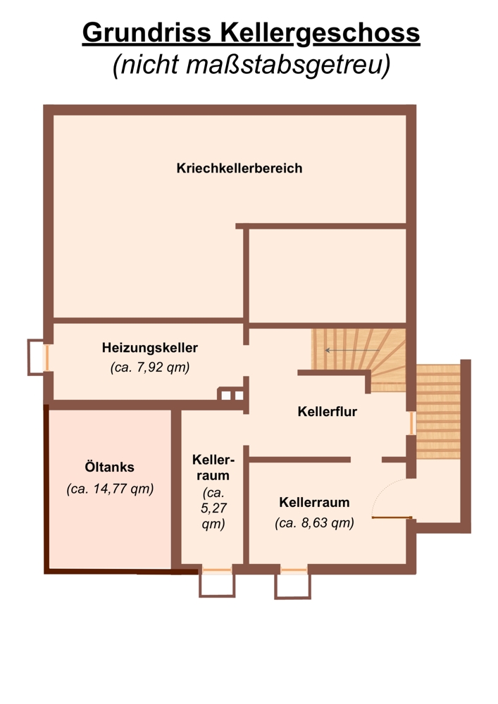 Der vorhandene Kellerbereich (Stehhöhe 2,10 m) ist komplett gefliest (erneuert 2025) und vielseitig nutzbar. Insgesamt verfügt das Haus über vier Kellerräume (ein Raum mit Außenzugang, Waschküche, Heizungsraum, Kriechkeller). Hier ist auch die Ölzentralheizung, Baujahr 1984 untergebracht.