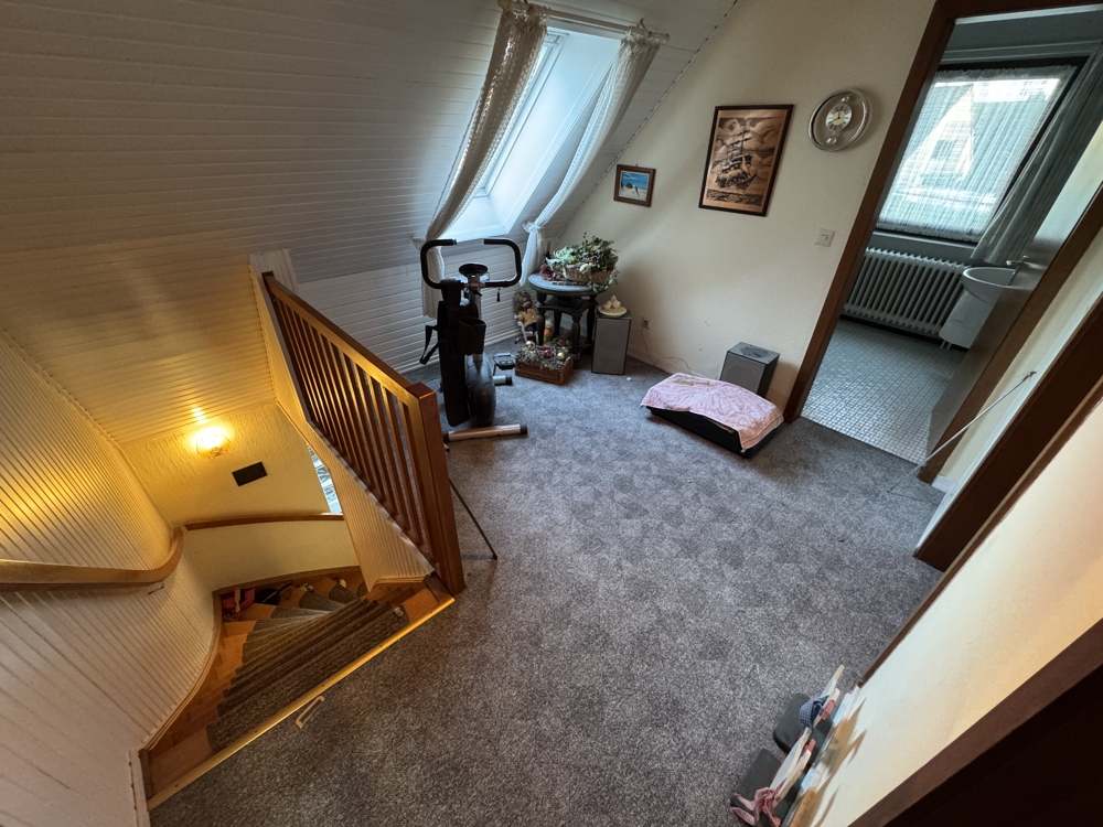 Via Holztreppe gelangen Sie in das Obergeschoss, wo Sie drei weitere Räume und ein Duschbad vorfinden werden. Zwei Kinderzimmer und ein großer Hobbyraum mit ca. 27 m² Nutzfläche schaffen ideale Voraussetzungen für das Familienleben. Vom Flur gelangen Sie über eine Bodeneinschubtreppe in den Spitzboden. Dieser dient allerdings aufgrund der Gegebenheiten eher als Abstellfläche.