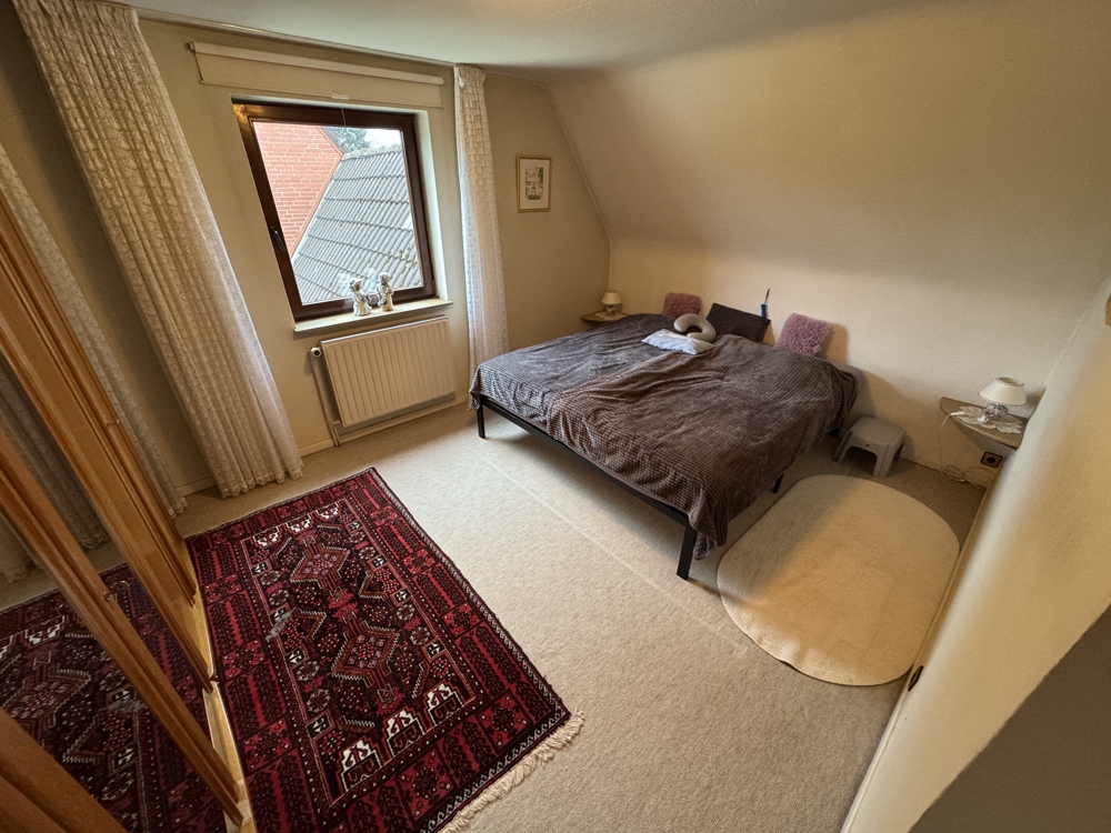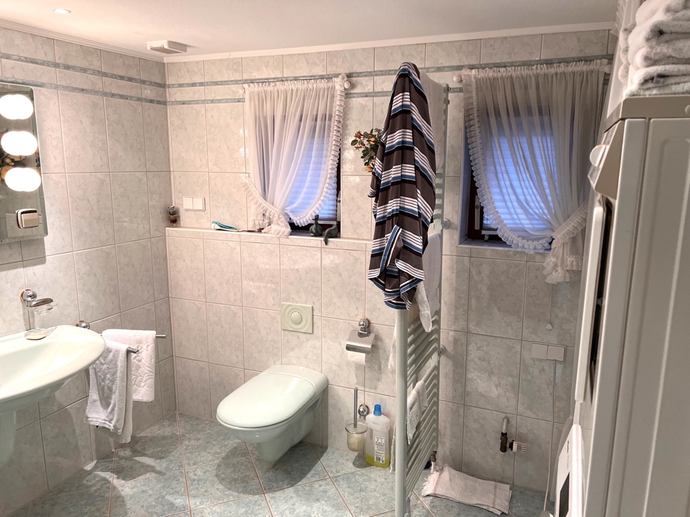Ergänzt wird das Wohngebäude durch ein zurückgesetztes Nebengebäude mit Garage. Im Nebengebäude befindet sich die Gasheizung (Marke „Vaillant“, Baujahr ca. 2006). Die schmale Zufahrt zur Garage teilen Sie sich per „Wegerecht“ mit dem Nachbarn.